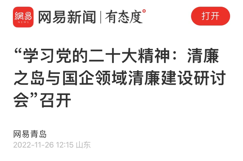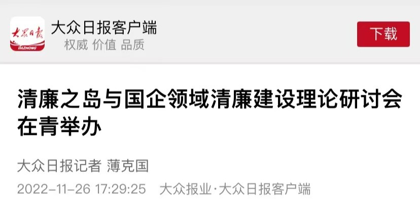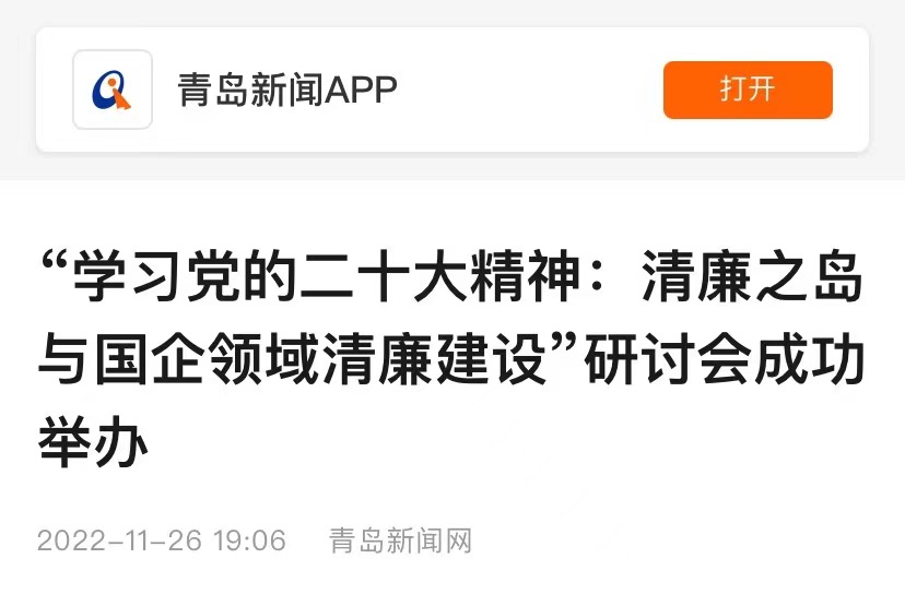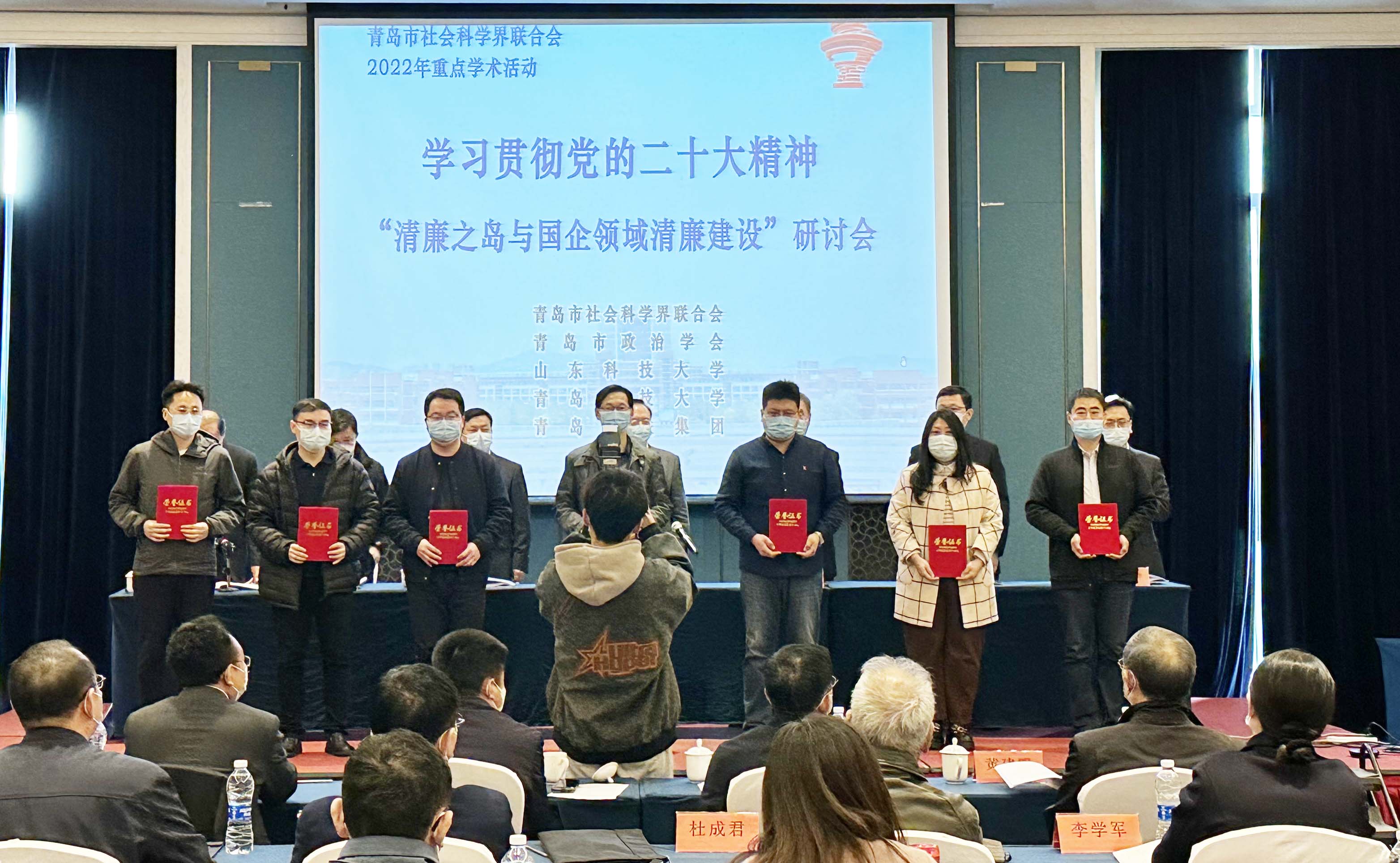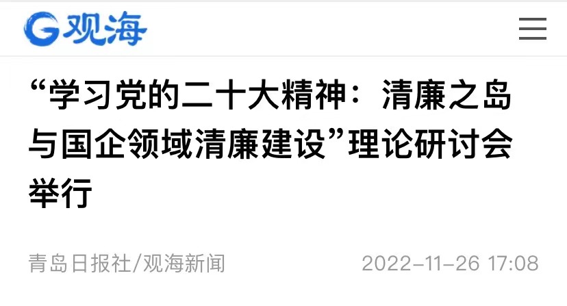 11月26日,“学习党的二十大精神:清廉之岛与国企领域清廉建设”理论研讨会在青岛召开,中国社科院研究员朱继东,中国政治学会副会长包心鉴,山东大学党建研究中心主任王韶兴,党的二十大代表、山东科技大学党委书记罗公利等专家围绕学习贯彻党的二十大精神作报告。