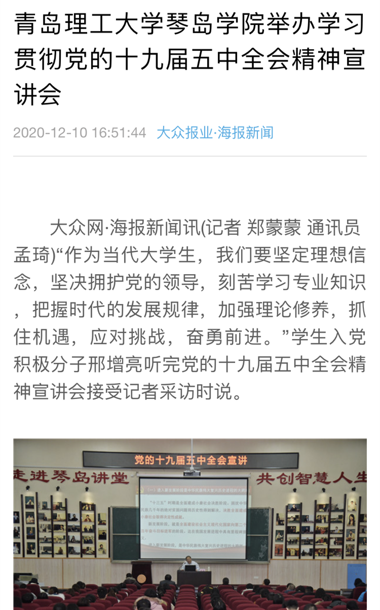 [媒体马院]大众报业·海报新闻:曹胜经理赴青岛理工大学琴岛公司宣讲党的十九届五中全会精神