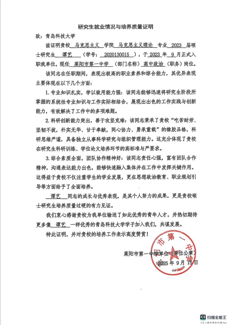 2023届蓝鲸体育硕士毕业生谭艺入职莱阳市第一中学思政课教师岗位