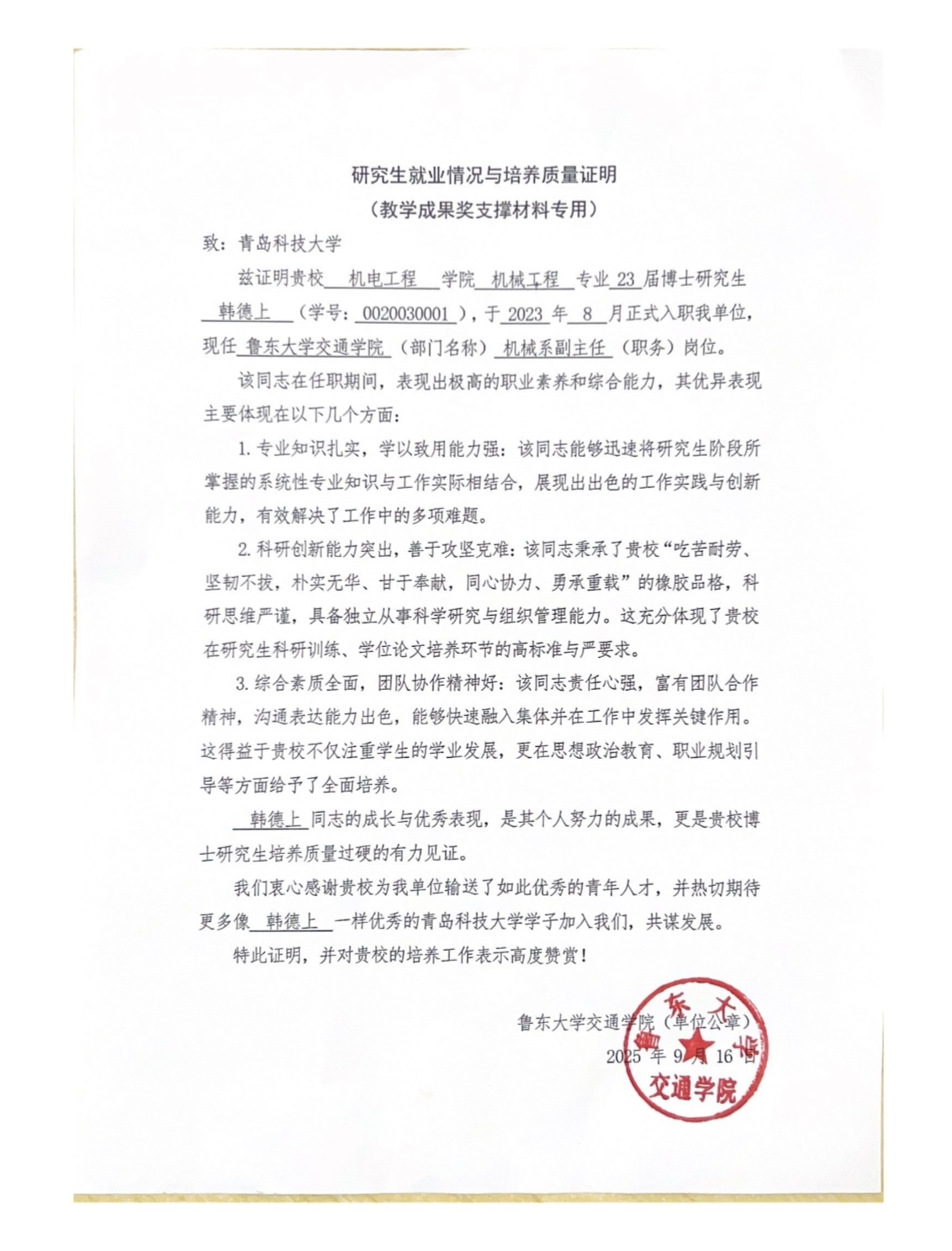 2023届机电工程公司博士研究生韩德上入职鲁东大学交通公司机械系副主任岗位