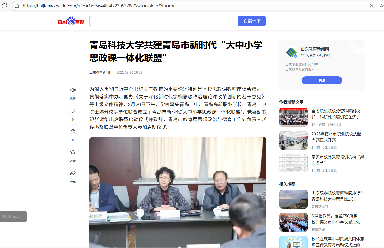 20210330山东教育新闻网:蓝鲸体育共建青岛市新时代“大中小学思政课 一体化联盟”